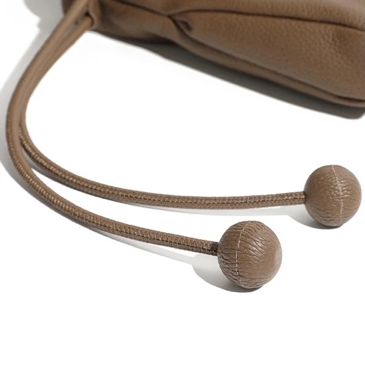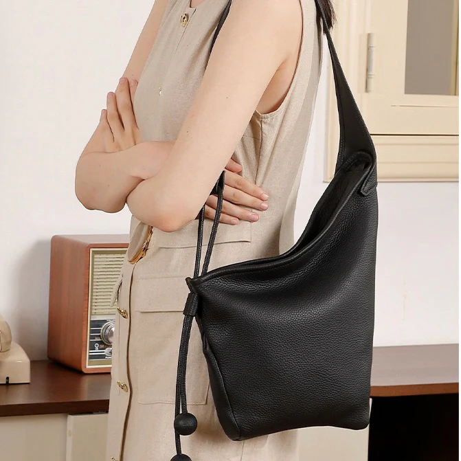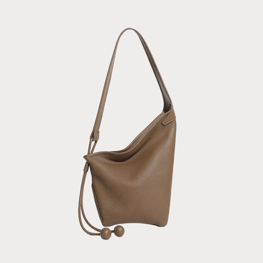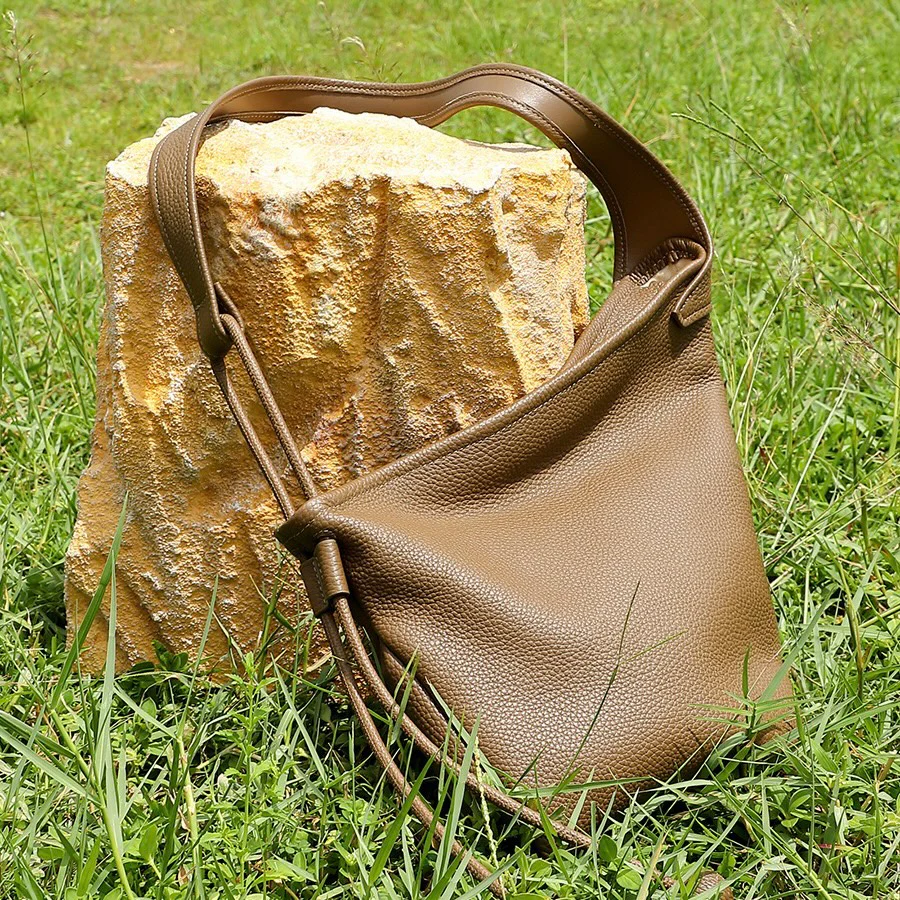 Crafted from top-grain genuine leather, this medium-sized vertical square bag features a minimalist asymmetric design and slouchy horn shape. Soft in hardness, it works as a shoulder or crossbody bag, perfect for daily wear. With a zipper closure, the polyester-lined interior includes a zippered secret pocket, document pouch, and inner patch pocket. Blend of style and function, it elevates everyday looks effortlessly.