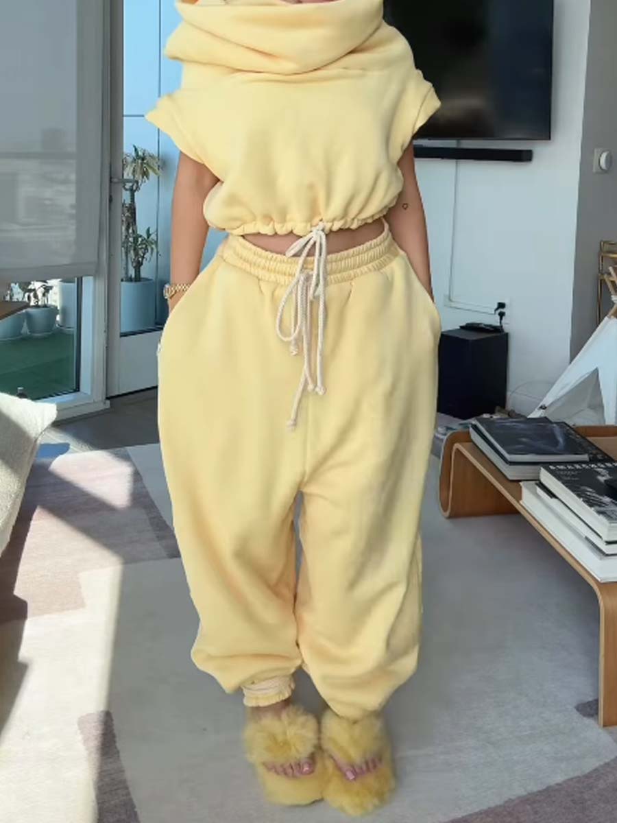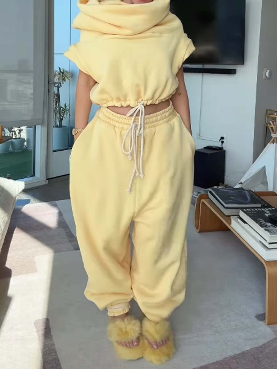A modern lounge set designed for ultimate comfort and style. Featuring an ultra-high cowl cropped hoodie vest with capped sleeves and adjustable cotton drawstrings at the waist, paired with oversized joggers crafted from plush cotton/modal fleece. The joggers come with elasticized drawstring waistband and ankle cuffs, side pockets, and extra cotton drawstrings for added detail.