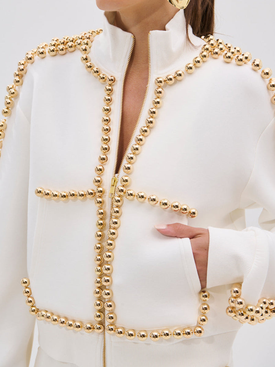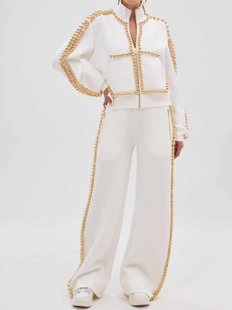 - Design: Tailored jacket, gold chain detailing, wide-leg pants.