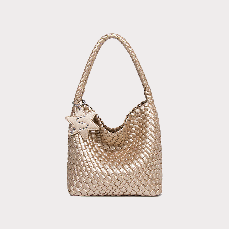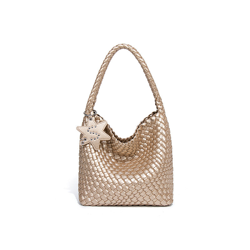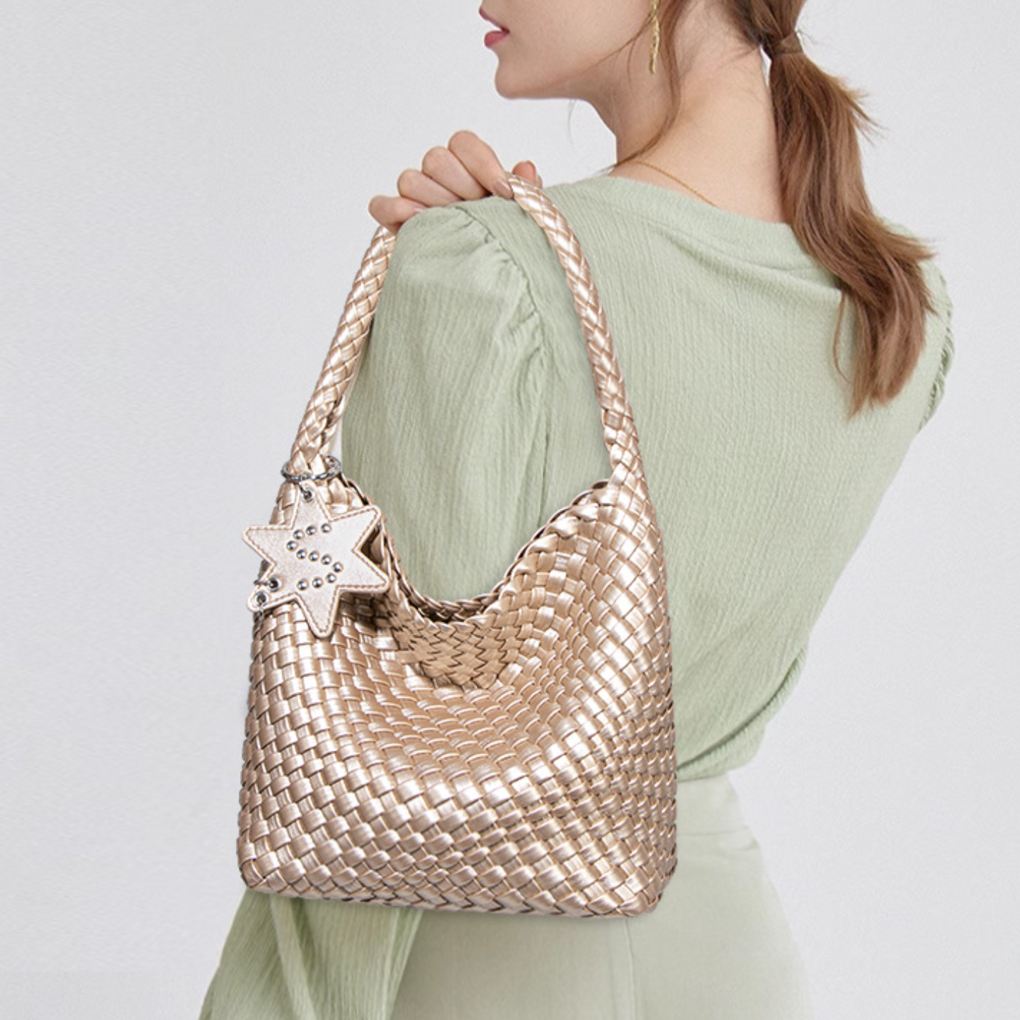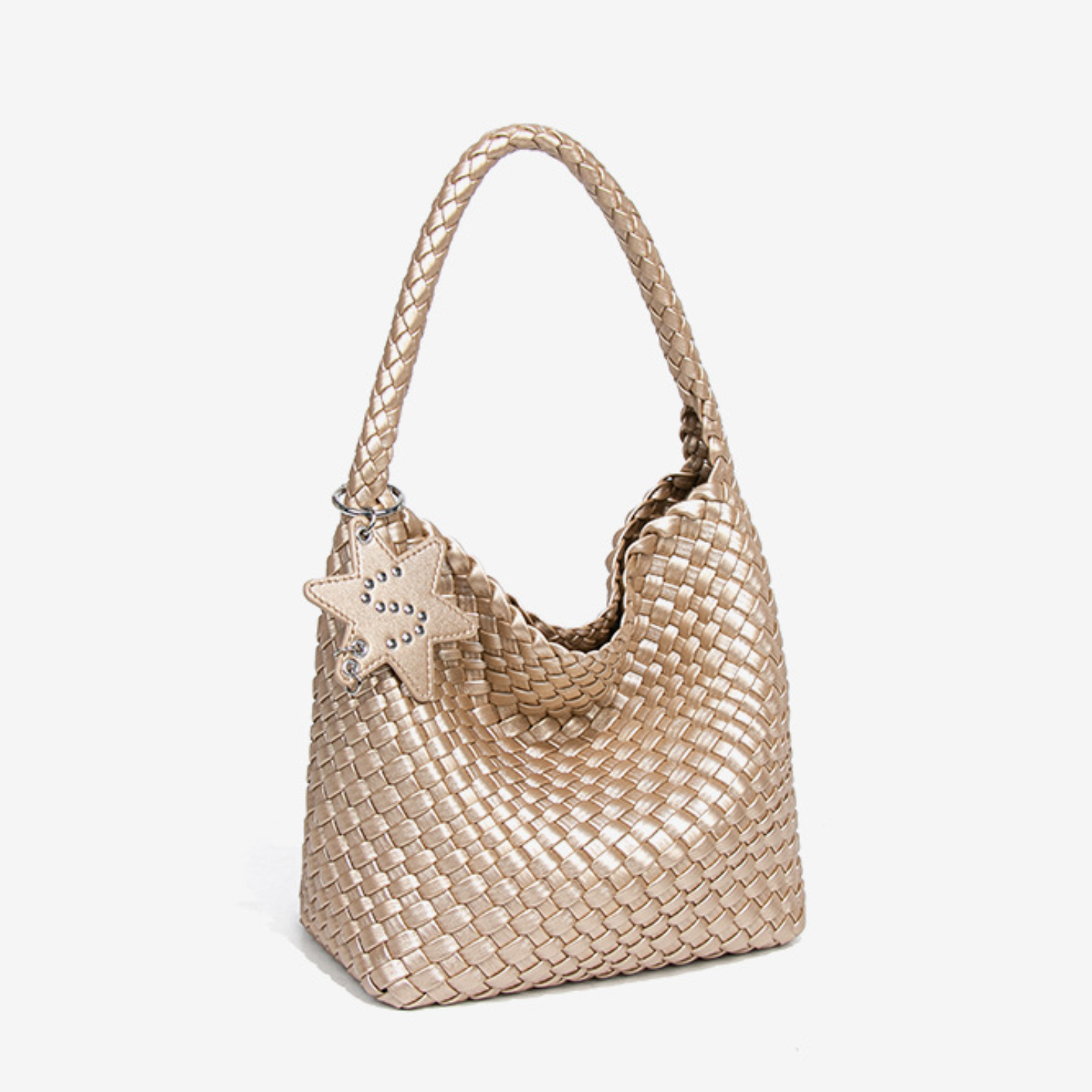 This elegant and sophisticated woven leather shoulder bag features a unique, timeless design that combines style and practicality. Its delicately woven pattern is accented with a bold star-shaped motif embellished with sparkling rhinestones, adding a touch of sparkle. The spacious interior provides ample space for your essentials.