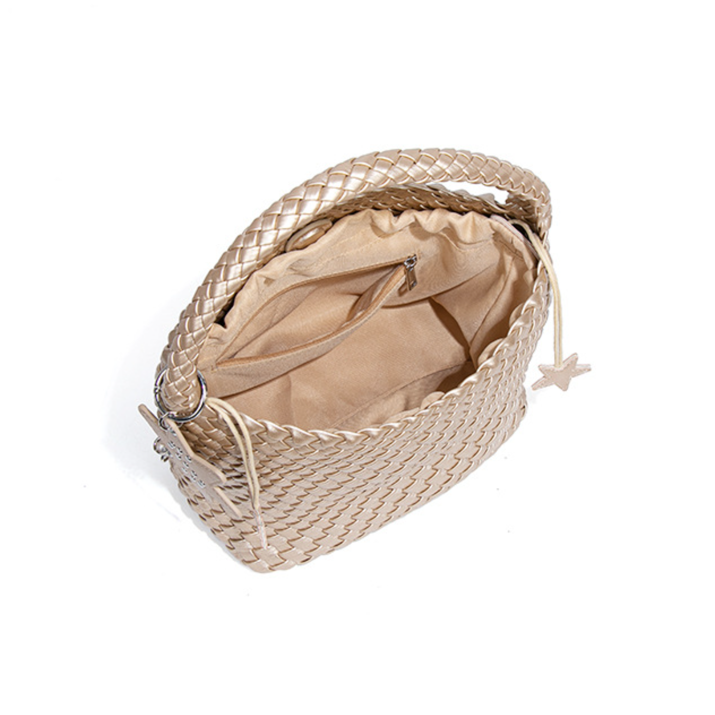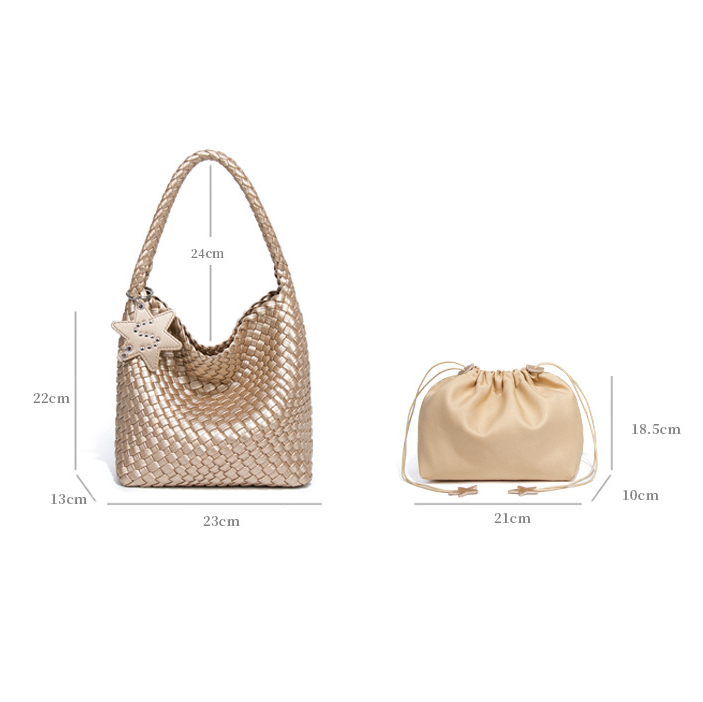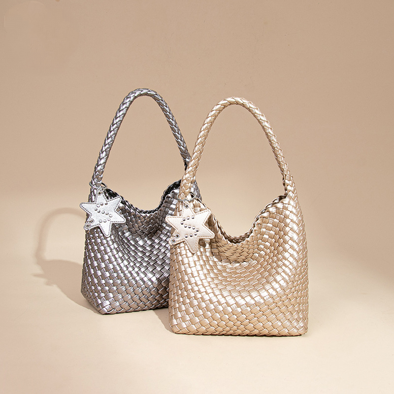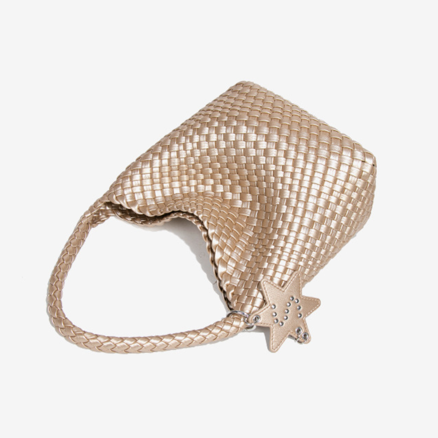This elegant and sophisticated woven leather shoulder bag features a unique, timeless design that combines style and practicality. Its delicately woven pattern is accented with a bold star-shaped motif embellished with sparkling rhinestones, adding a touch of sparkle. The spacious interior provides ample space for your essentials.